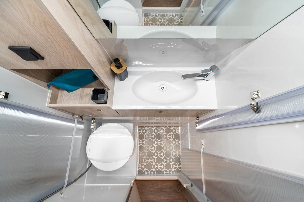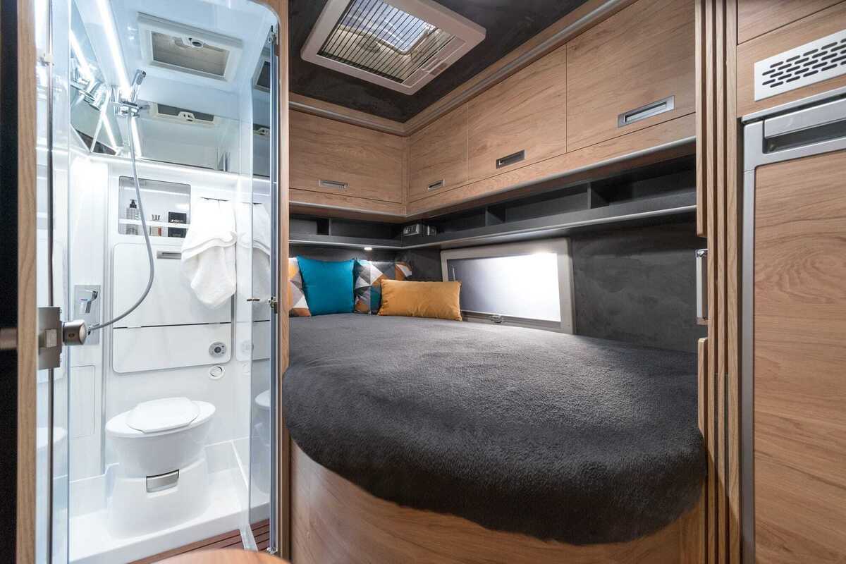 Vannasistaba izvietota blakus franču gultai, radot dabisku sadalījumu starp priekšējo un aizmugurējo zonu